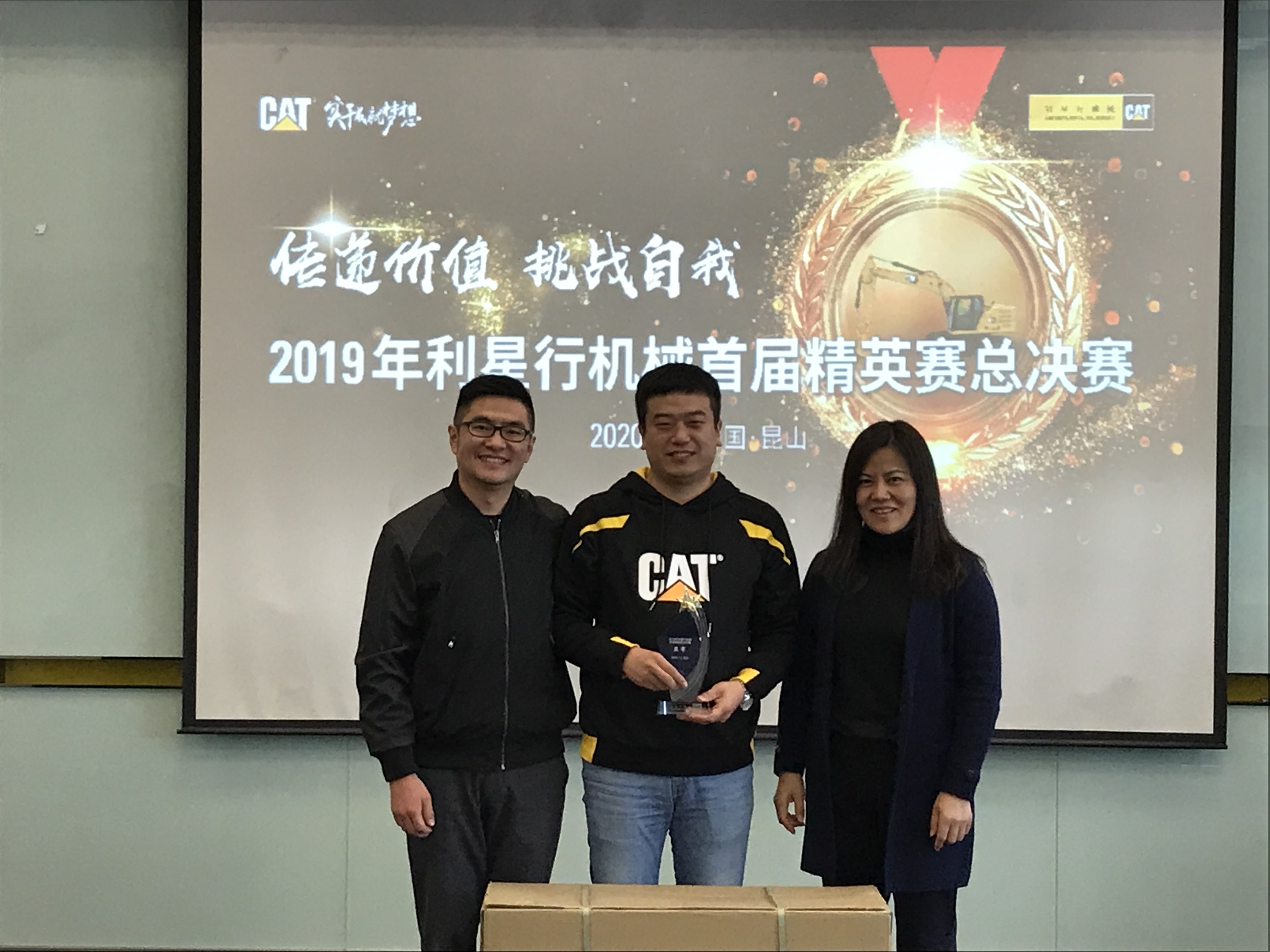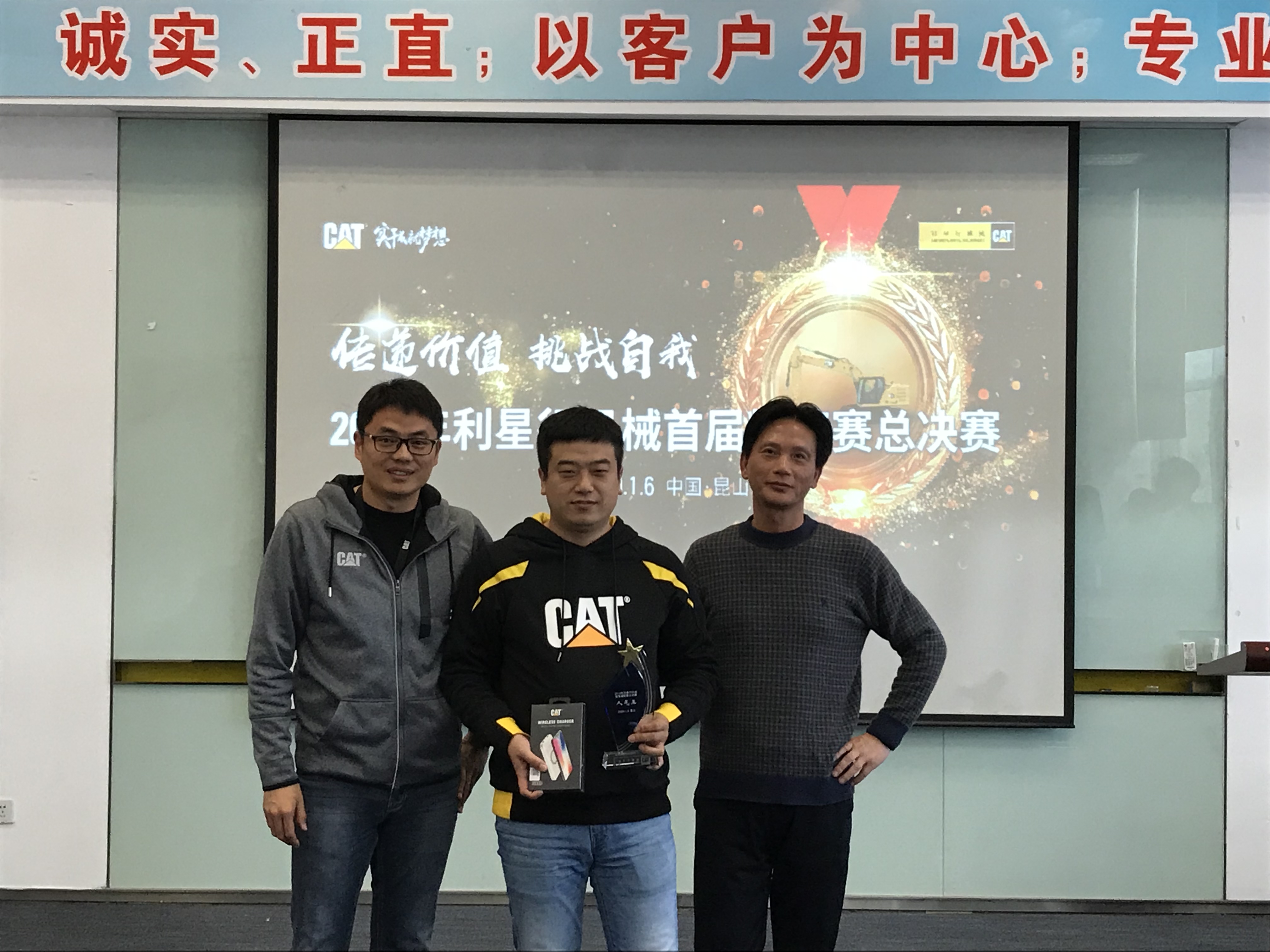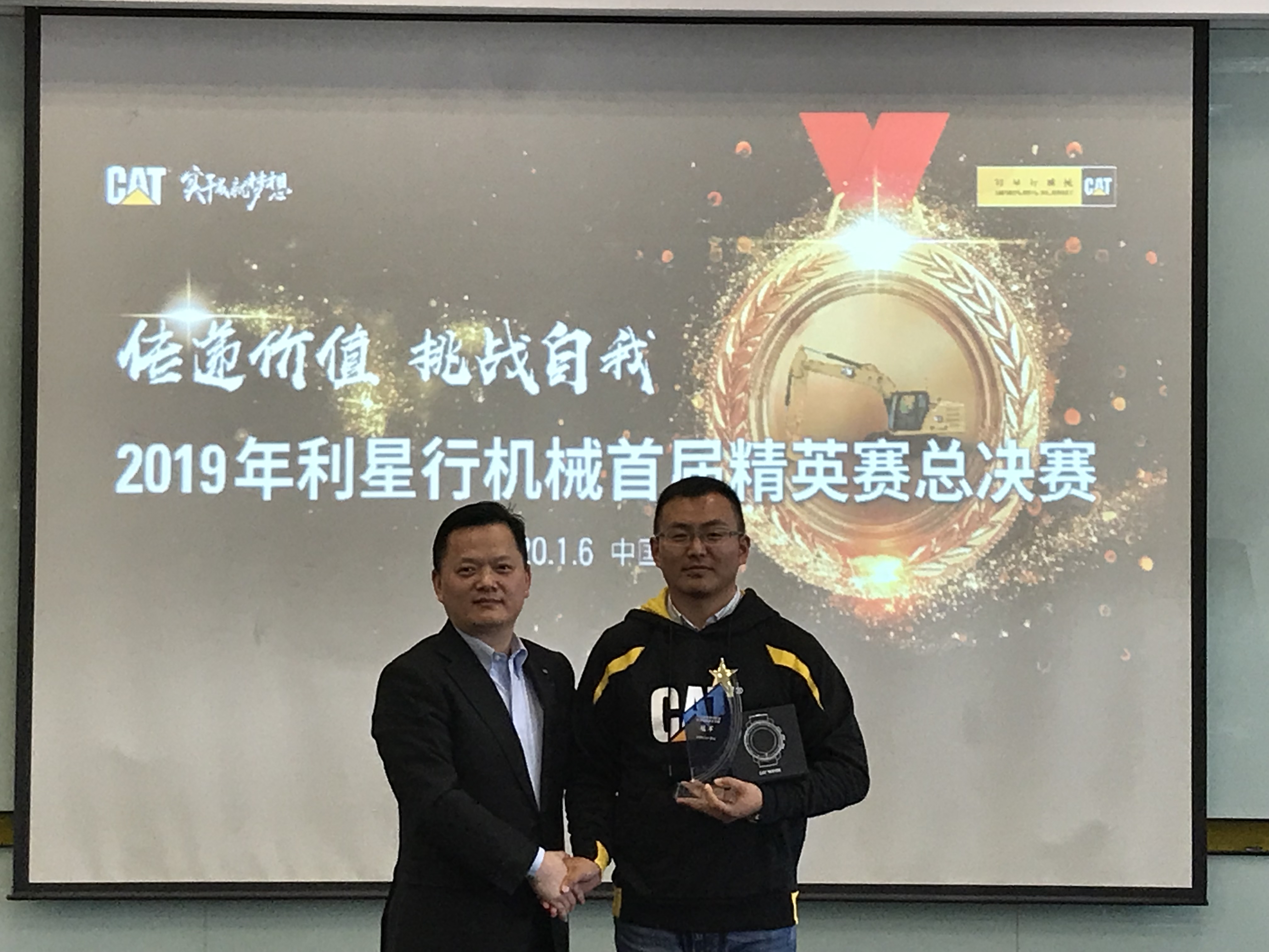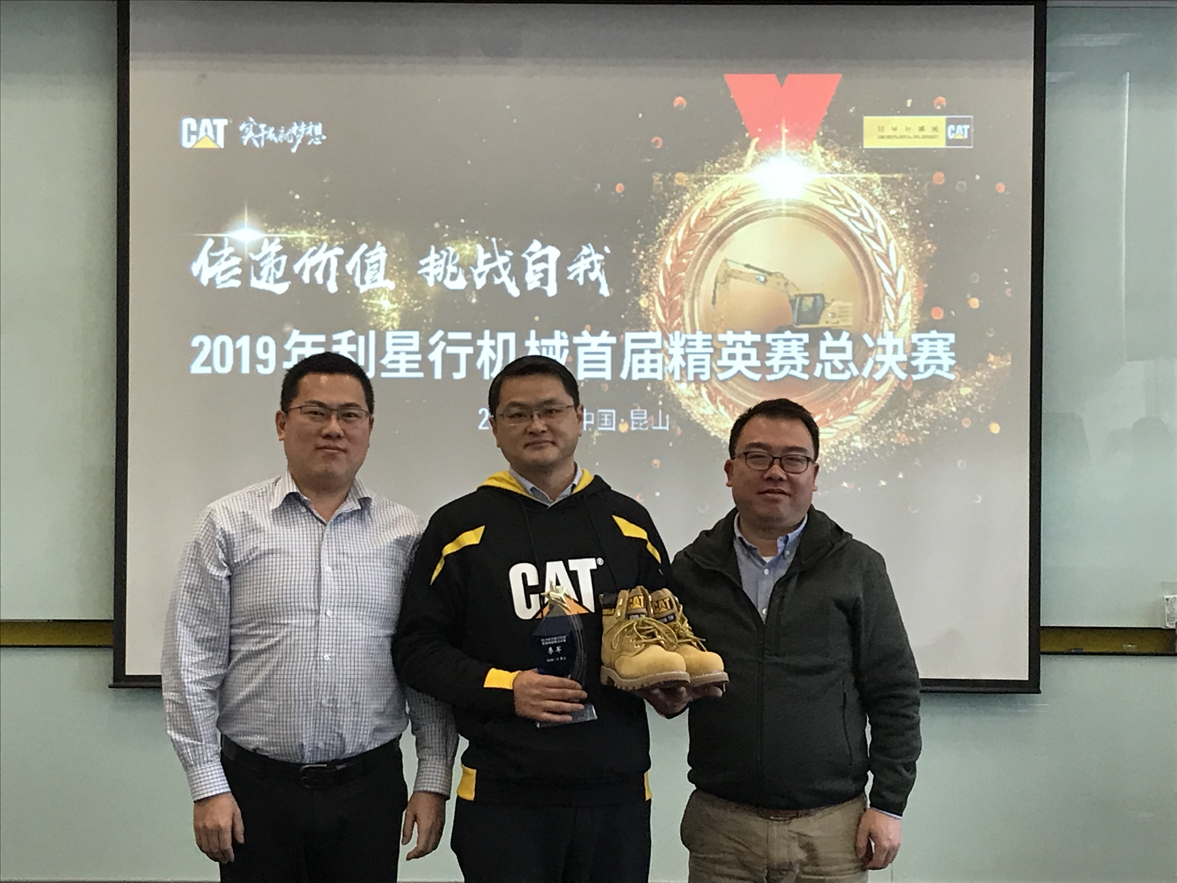 現場比賽季軍獲得者:安徽靳朝中,獎品:卡特大黃靴,大賽評委桑子博(卡特彼勒BCP產品經理)及解軍(卡特彼勒GCI 產品經理)進行了頒獎。
